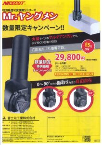 キャンペーン YKアキュラシー株式会社のキャンペーン情報一覧ページです。さまざまな情報をお知らせいたします。 2025/10/06 キャンペーン NICECUT数量限定キャンペーンのご紹介! NICE CUT数量限定キャンペーン!! ↑画像はそれぞれ拡大出来ます。 こんにちは!今回はまさに漢!!みたいな名前の 面取りMR.ヤングメンこと面取りカッターが特別価格になった のでご案内します!キャンペーンとしてこの度お安く して頂いたのですが~衝撃の55%オフで買えてしま うんです!0~90度まで面取りが自在に可能で使いや すいこの商品…普通に買うよりも断然!お得です! この機会是非!貴社の皆様もお申込み下さいませ!! 前のキャンペーンへ 一覧に戻る